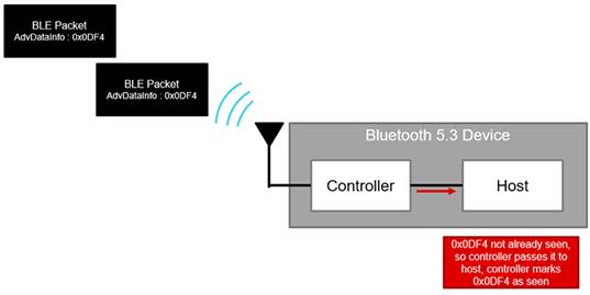 使用周期性廣告的BLE設(shè)備通常會多次發(fā)送信息,以增加傳輸?shù)亩鄻有圆⑻岣邟呙柙O(shè)備正確解碼的可能性。因此,偵聽器設(shè)備可能會接收到同一分組的多個副本,并且會浪費功率多次解碼同一信息。