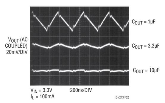 即使采用小型輸出電容器,器件的2MHz振蕩頻率也可允許低輸出紋波,圖2給出了LTC3200-5采用不同值的輸出電容器支持100mA負(fù)載電流時(shí)的輸出紋波情況。