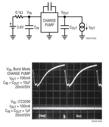 大多數(shù)可調(diào)節(jié)的充電泵DC/DC轉(zhuǎn)換器采用Burst Mode突發(fā)方式架構(gòu)。雖然這種調(diào)節(jié)器結(jié)構(gòu)具有最低的靜態(tài)電流,但所產(chǎn)生的輸入和輸出噪聲也最大。采用突發(fā)方式的器件,充電泵開關(guān)向輸出提供最大電流,或完全被關(guān)斷。為了對輸出進(jìn)行調(diào)節(jié),遲滯比較器和基準(zhǔn)控制了充電泵的導(dǎo)通和關(guān)斷。當(dāng)輸出端有低頻紋波產(chǎn)生時(shí),需要加以調(diào)節(jié)(如圖1所示)。這種一開一關(guān)的突發(fā)將導(dǎo)致較大的輸入紋波電流,因此,必須由輸入電源供電。輸入電源中的任何阻抗都會(huì)在輸入端產(chǎn)生電壓噪聲,這種噪聲必須由采用相同電源供電的其它電路排除掉。