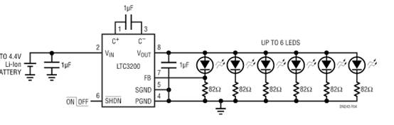 充電泵通常為手機(jī)和PDA等手持電子設(shè)備提供低功率升壓轉(zhuǎn)換。這些設(shè)備,尤其是那些含有RF通訊電路的產(chǎn)品,對噪聲十分敏感。低噪聲充電泵的一個(gè)流行應(yīng)用是給白光LED供電,以便為小型彩色LCD顯示器提供背光。圖4所示的電路是一低噪聲升壓電源,最多可驅(qū)動(dòng)6只白光LED,LTC3200的FB引腳用來調(diào)節(jié)流經(jīng)每只LED鎮(zhèn)流管上的LED電流。采用LTC3200,用戶可直接利用電池為背光電路提供升壓電源,免除了笨拙的低頻噪聲過濾問題。