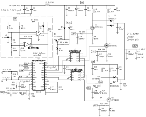 圖 1 顯示了一款使用了 TI 的TPS40090 多相降壓控制器的 4 相、300W 升壓電源,該轉(zhuǎn)換器設(shè)計(jì)旨在處理一般會(huì)出現(xiàn)在音頻應(yīng)用中的 500W 峰值猝發(fā)。通常,在多相降壓結(jié)構(gòu)中,該控制器通過(guò)感應(yīng)輸出電感中的平均電流來(lái)平衡每一相位的電力。相反,在一個(gè)多相升壓結(jié)構(gòu)中,對(duì)電流的感應(yīng)是在安裝于每一個(gè) FET 源極上的電阻器中進(jìn)行的。通過(guò)在每一個(gè) FET 中平衡峰值電流,多相控制器在所有升壓相位中均勻地分配電力。來(lái)自控制器的柵極驅(qū)動(dòng)信號(hào)為邏輯電平,因此每一個(gè)相位都要求具有一個(gè) MOSFET 驅(qū)動(dòng)器。本設(shè)計(jì)中,可以使用一個(gè)雙通道 MOSFET 驅(qū)動(dòng)器(例如:UCC27324)來(lái)減少組件的數(shù)量。
