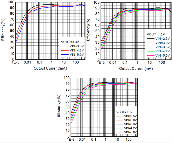 通過采用3個VSEL引腳編碼,WD1020/WD1021可以實現(xiàn)8個不同的電壓輸出。在輸入電壓降低到接近輸出時,可自動切換到100%占空比模式運行,拓寬電池工作電壓范圍,增強電池續(xù)航能力;根據(jù)負載大小不同,WD1020/WD1021還可自動切換運行于PFM或PWM模式,保證在輕載(<1mA)到滿載的整個負載范圍都維持業(yè)界領(lǐng)先的運行效率。