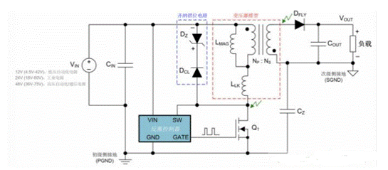 圖 1:采用典型的 24V 電源或 12V/48V 輸入(分別用于工業(yè)或汽車電池應用)的 DC-DC 反激式穩(wěn)壓器。圖中已明確標出具有磁化作用的反激式變壓器、漏電感以及電路寄生電容