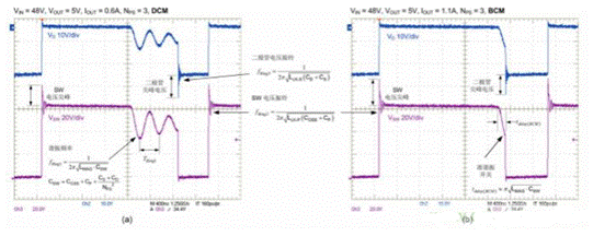 圖 2 所示為以非連續(xù)模式 (DCM) 和邊界導通模式 (BCM) 運行的反激式功率級(如圖 1 所示)的初級側(cè) MOSFET 和次級側(cè)整流二極管電壓波形[8]。圖 2a 突出顯示了 DCM 模式下的開關(guān)波形,其中初級側(cè) MOSFET 在開關(guān)節(jié)點諧振電壓擺幅的谷值附近導通。圖 2b 所示為 BCM 開關(guān)波形,其中準諧振 MOSFET 在從二次側(cè)繞組電流衰減到零起約半個諧振周期延遲之后導通。在 DCM 和 BCM 模式下,初級側(cè) MOSFET 均在零電流時導通。