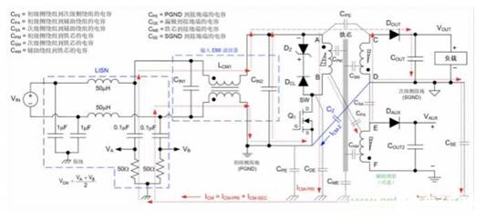 圖 3:雙線 DC-DC 反激式穩(wěn)壓器(輸入端連接有 LISN)的 CM 噪聲電流傳播路徑。同時,還顯示了初級側(cè)基準的輔助輸出端