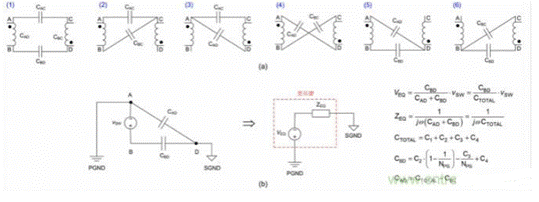 圖 5:(a) 六種可能的雙電容 CM 模型;(b) 雙電容 CM 模型及其戴維寧等效電路