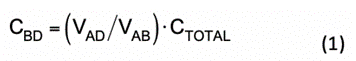 雙電容 CM 噪聲模型可靈活地用于不同的隔離型穩(wěn)壓器拓撲,并有助于通過實驗測量推導出變壓器集總電容模型[13]。CTOTAL是用阻抗分析儀測得的變壓器結(jié)構(gòu)化繞組間電容,測量時將初級側(cè)和次級側(cè)端子短接,然后將變壓器用作單端口網(wǎng)絡(luò)。對初級側(cè)繞組端子(A、B)施加源阻抗為 50W 的開關(guān)頻率正弦激勵信號,并測量 VAD與 VAB的電壓比,可由公式 1 推導出 CBD: