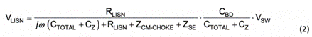 與電壓源并聯(lián)或與電流源串聯(lián)的元器件對網(wǎng)絡(luò)中的電壓或電流無影響,因此可以去除。疊加定理可幫助分別分析 IDCL、IDOUT和 VSW的作用。顯然,IDCL和 IDOUT已短路,不會產(chǎn)生 CM 噪聲。圖 7b 顯示的是最終 CM 模型,公式 2 可計算在 LISN 測得的 CM 噪聲電壓: