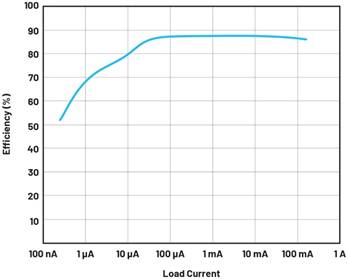 圖3中的效率曲線顯示了輸出電流非常低(如1 µA)時可以達到的效率。這就節(jié)省了大量能量,尤其是在長時間工作和低負載的應用中。