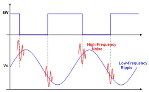 最容易觀察到的噪音,也是能直接影響電路性能的噪音就是開關(guān)頻率下的紋波。這種紋波通常在 10 - 20 mV 的范圍內(nèi)(圖 1 )。雖然這種紋波在本質(zhì)上不是隨機的,但仍然是一種會造成系統(tǒng)性能影響的噪音表現(xiàn)。這種紋波的毫伏水平對于工作電壓為 5 V 伏及以上的高電壓數(shù)字集成電路來說通常不會帶來任何問題,但對于工作電壓低于 3 V 的低電壓數(shù)字電路來說,就是一個不可忽略的問題。電源軌上的波紋也是精密模擬電路和元件的一個主要問題,這就是為什么這類設(shè)備的電源抑制比 (PSRR) 規(guī)格至關(guān)重要。