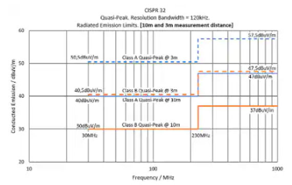 圖 2:這是 CISPR 32/EN 55032 提供的眾多圖表之一,它定義了各類消費產(chǎn)品的發(fā)射限制與頻率的關(guān)系。(圖片來源:Academy of EMC,《EMC 標準》)