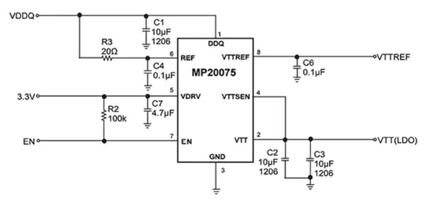 圖 3:MP20075 LDO 可拉出或灌入高達 3 A 的電流,并針對各類 DDR SRAM 的端接需求進行了優(yōu)化。(圖片來源:Monolithic Power Systems)