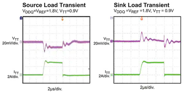 MP20075 的集成分壓器跟蹤參考電壓 (REF),可確保準確的 VTT 和 VTTREF 輸出電壓,而開爾文檢測則有助于實現(xiàn) VTT 的 ±30 mV 和 VTTREF 的 ±18 mV 精度。此外,與大多數(shù) LDO 一樣,純模擬的閉環(huán)拓撲結(jié)構(gòu)對輸出負載的瞬態(tài)響應(yīng)非?欤恍鑾孜⒚氲臅r間(圖 4)。這種瞬態(tài)響應(yīng)在高速電路中往往是至關(guān)重要的,例如本 LDO 的設(shè)計目標:DDR SRAM 端接。