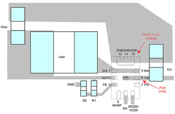 圖 7:MP2145 的輸入電容(此處為 Cin,見右下角;圖 5 原理圖中為 C1)應(yīng)盡可能靠近第 8 個引腳(電源輸入引腳)和第 10/11/12 個引腳(電源 GND 引腳)。(圖片來源:Monolithic Power Systems)