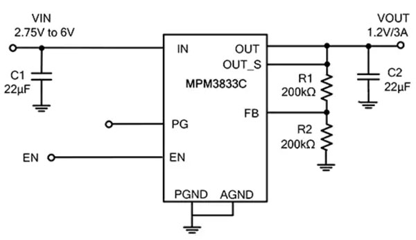 例如,MPM3833C 是一款降壓模塊,內(nèi)置功率 MOSFET 和一個電感器,能夠在 2.75 V 至 6 V 輸入電壓下提供高達 3 A 的連續(xù)輸出電流,同時具有出色的負載和線路調(diào)節(jié)能力(圖 8)。只需反饋電阻、輸入電容和輸出電容即可完成設(shè)計。電感器通常是最難指定和放置的外部元器件,但對于模塊來講電感器是內(nèi)部器件,因此在為了盡量減少電磁干擾 (EMI) 和紋波而需考慮合適的放置位置已不再是一個問題了。