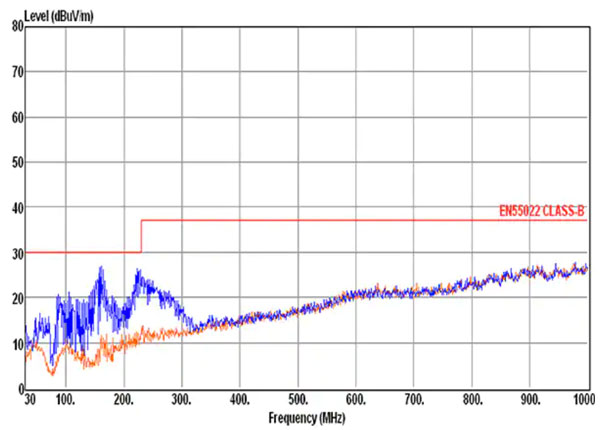 圖 9:MPM3833C DC/DC 模塊的數(shù)據(jù)表顯示,該器件很容易滿足 EN55022 B 類標準的輻射排放要求。(圖片來源:Monolithic Power Systems)