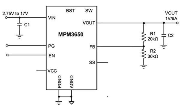 圖 5:MP2145 是一款 5.5 V、6 A 同步降壓開關(guān)穩(wěn)壓器,在其 2×3 mm QFN 封裝中含有完整的 20 mΩ 和 12 mΩ MOSFET。(圖片來源:Monolithic Power Systems)