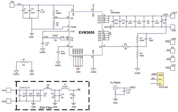 圖 12:使用 EVM3650-QW-00A 評估板,有意向的 MPM3650 DC/DC 模塊用戶可以快速評估其在應(yīng)用中的性能。(圖片來源:Monolithic Power Systems)