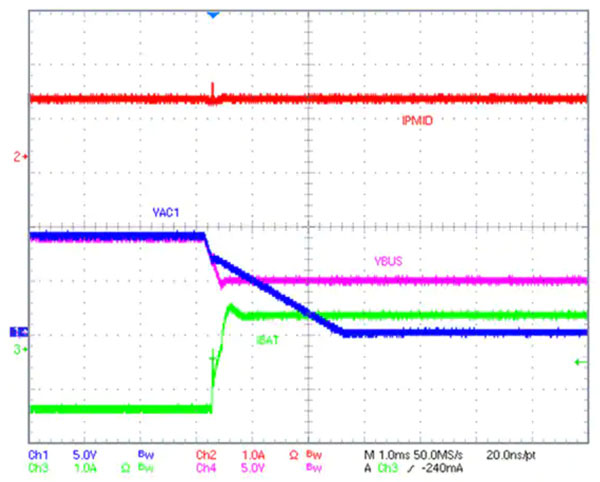 使用備用模式時,充電器會不斷監(jiān)測 VBUS 電壓。當 VBUS 下降到閾值水平以下時(表明失去了來自適配器的輸入),充電器會迅速從充電模式轉(zhuǎn)變?yōu)?OTG 模式,從電池放電,調(diào)節(jié) VBUS 電壓,并進行 FRS,而不需要額外的 DC-DC 轉(zhuǎn)換器。在 BQ25792 中用備用電源模式實現(xiàn) FRS,可以確保任何連接到 PMID 引腳的配件在 VBUS 電壓下降時不會失去電源(圖 3)。