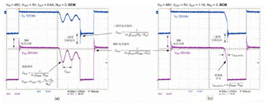 圖 2:以 DCM (a) 和 BCM (b) 模式運行的反激式轉換器初級側 MOSFET 和次級側二極管電壓波形;跨越初級側繞組的 DZ 電路可鉗位與漏電感相關的電壓尖峰