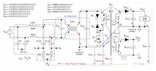 圖 3:雙線 DC-DC 反激式穩(wěn)壓器(輸入端連接有 LISN)的 CM 噪聲電流傳播路徑。同時,還顯示了初級側基準的輔助輸出端