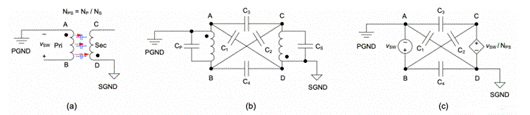 圖 4a 所示為雙繞組變壓器,初級側端子和次級側端子分別由(A、B)和(C、D)表示。端子 A 根據輸入總線電容等效連接到 PGND,在 CM 噪聲分析的適用頻率下表現為有效短路。圖 4b 顯示的是變壓器的傳統(tǒng)靜電模型。從節(jié)能角度來看,可建立包含六個電容的雙繞組變壓器的寄生電容模型,其中包括四個繞組間電容(C1、C2、C3、C4)和兩個繞組內電容(CP、CS)。