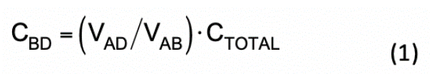 雙電容 CM 噪聲模型可靈活地用于不同的隔離型穩(wěn)壓器拓撲,并有助于通過實驗測量推導出變壓器集總電容模型[13]。CTOTAL是用阻抗分析儀測得的變壓器結構化繞組間電容,測量時將初級側和次級側端子短接,然后將變壓器用作單端口網絡。對初級側繞組端子(A、B)施加源阻抗為 50W 的開關頻率正弦激勵信號,并測量 VAD與 VAB的電壓比,可由公式 1 推導出 CBD: