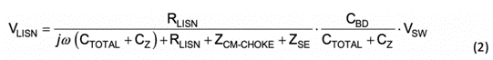 與電壓源并聯(lián)或與電流源串聯(lián)的元器件對網絡中的電壓或電流無影響,因此可以去除。疊加定理可幫助分別分析 IDCL、IDOUT和 VSW的作用。顯然,IDCL和 IDOUT已短路,不會產生 CM 噪聲。圖 7b 顯示的是最終 CM 模型,公式 2 可計算在 LISN 測得的 CM 噪聲電壓: