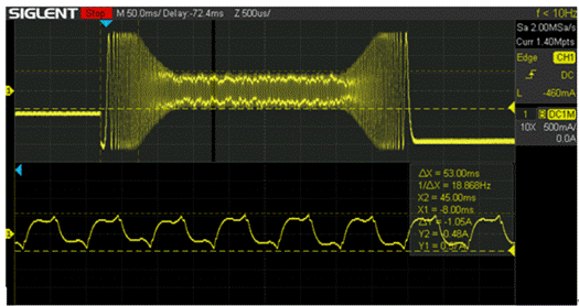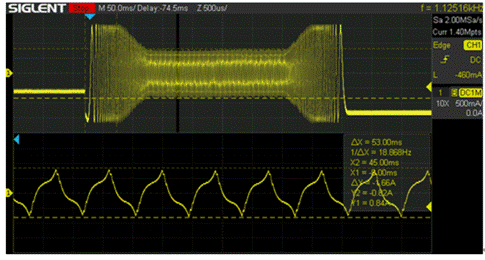 黃色曲線表示通過電機線圈的電流,青色線表示正在接通/斷開的電壓.該測量是在待機期間進行的,此時電機不旋轉(zhuǎn),但保持其位置.電流幾乎是恒定的,電壓有規(guī)律地在短時間內(nèi)打開,然后再關閉.請注意,這種切換正在發(fā)生超過30000次每秒!