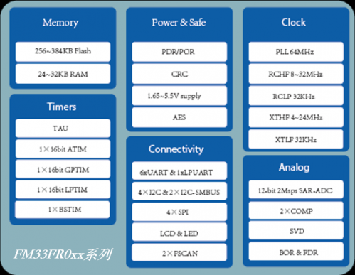 FM33FR0系列基于32位 ARM Cortex-M0內(nèi)核,最高主頻為48MHz,提供最大384KB Program FLASH,8KB Data FLASH(50萬次擦寫),flash支持ECC;最大32KB RAM,帶有奇偶校驗;支持LQFP44 / LQFP48 / LQFP64 / LQFP80 / LQFP100多種封裝形式。