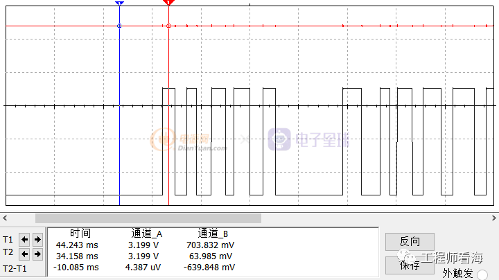下圖是R4 ESR取0.1Ω時(shí)的輸出結(jié)果,黑色曲線是從70mA到700mA反復(fù)切換負(fù)載電流的電流波形,紅色是輸出電壓波形,可以看到電流變化時(shí),輸出電壓只有微小的波動(dòng),整體還是穩(wěn)定在3.2V。