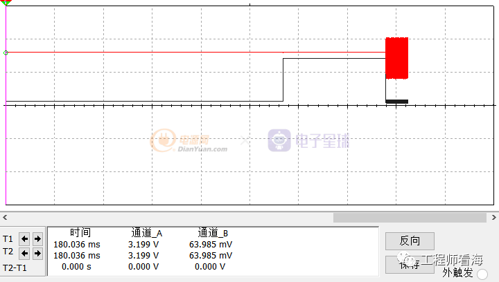 下圖是把ESR改為100Ω后的結(jié)果,剛開始輸出是穩(wěn)定的,切換負(fù)載電流時(shí),輸出也容易出現(xiàn)異常。