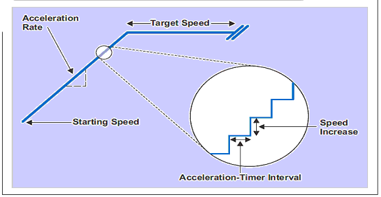 在馬達(dá)啟動前不久,便進行一次加速速率計算。負(fù)責(zé)該計算的軟件,確定加速度定時器的時間間隔和增量因數(shù)大小,然后對各變量進行相應(yīng)的配置。同時使用這些變量,直到對 SPS 速率的修改足以達(dá)到目標(biāo)速度為止。一旦達(dá)到目標(biāo)速度,加速終止。