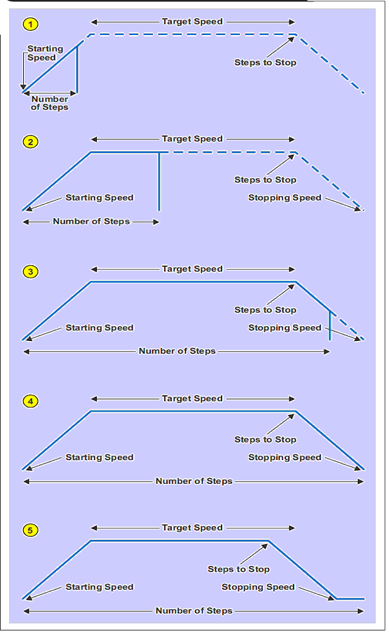 恰好在達(dá)到停止速度時馬達(dá)停止(情況4)是一種理想情況。在達(dá)到停止速度前不久(情況3)或者以后(情況5)馬達(dá)停止是可以接受的,具體取決于出現(xiàn)這些情況時距離理想情況還差多少個步進。例如,如果馬達(dá)轉(zhuǎn)動過快時所有步進結(jié)束,則馬達(dá)傳動軸可能會因轉(zhuǎn)動慣量而失去位置。但是,如果在所有步進執(zhí)行完以前達(dá)到停止速度,則執(zhí)行該次馬達(dá)運動控制所需的總時間會過長。