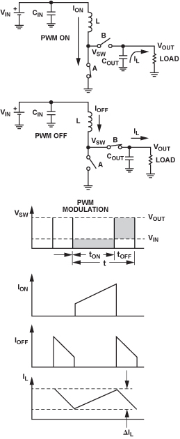 注意,開關(guān)調(diào)節(jié)器既可以連續(xù)工作,也可以斷續(xù)工作以連續(xù)導(dǎo)通模式 (CCM), 工作時(shí),電感電流不會(huì)降至0;以斷續(xù)導(dǎo)通模式 (DCM), 工作時(shí),電感電流可以降至0。 電流紋波,在圖2中顯示為ΔIL 使用公式ΔIL = (VIN ? tON)/L.計(jì)算。平均電感電流流入負(fù)載,而紋波電流流入輸出電容。