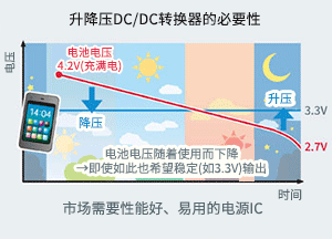 而要降低電源的功耗,就需要在任何負載條件和工作模式下都能抑制自身功耗并提高效率。電池輸入時,輸入電壓從比設定的輸出電壓高的初始電壓變?yōu)楸仍O定的輸出電壓低的電壓。因此,使用升降壓型轉換器是非常有助于最大限度地使用電池能量的,可以在輸入(電池)電壓比設定的輸出電壓高的狀態(tài)下,進行高效率的降壓工作,當輸入低于設定的輸出電壓時,切換為高效率的升壓工作,使輸出電壓保持在一定電壓。換句話說,無論輕負載還是重負載都高效率、無論降壓還是升壓都可高效率工作的升降壓轉換器可以說是能夠使電池壽命最大化的電源。