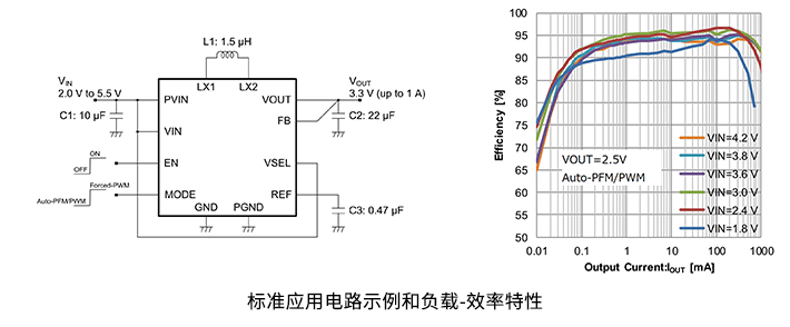 -在升降壓電源IC中消耗電流達到業(yè)界先進的2.8µA Typ(VIN=3.6V、 Auto-PFM/PWM、無負載)