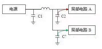 圖中電源為A和B供電。電流經(jīng)C1后再經(jīng)過一段PCB走線分開兩路分別供給A和B。當(dāng)A在某一瞬間需要一個很大的電流時,如果沒有C2和C3,那么會因為線路電感的原因A端的電壓會變低,而B端電壓同樣受A端電壓影響而降低,于是局部電路A的電流變化引起了局部電路B的電源電壓,從而對B電路的信號產(chǎn)生影響。同樣,B的電流變化也會對A形成干擾。這就是“共路耦合干擾”。