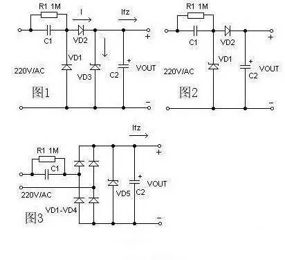 電容降壓式簡易電源的基本電路如圖1,C1為降壓電容器,D2為半波整流二極管,D1在市電的負(fù)半周時給C1提供放電回路,D3是穩(wěn)壓二極管,R1 為關(guān)斷電源后C1的電荷泄放電阻。在實際應(yīng)用時常常采用的是圖2的所示的電路。當(dāng)需要向負(fù)載提供較大的電流時,可采用圖3所示的橋式整流電路。整流后未經(jīng)穩(wěn)壓的 直流電壓一般會高于30伏,并且會隨負(fù)載電流的變化發(fā)生很大的波動,這是因為此類電源內(nèi)阻很大的緣故所致,故不適合大電流供電的應(yīng)用場合。