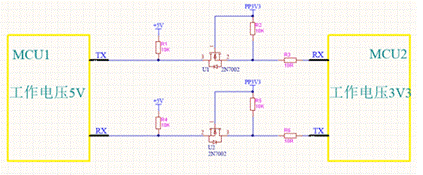 RX為0V。該電路從MCU1到MCU2方向,數(shù)據(jù)傳輸,達到了電平轉(zhuǎn)換的效果。