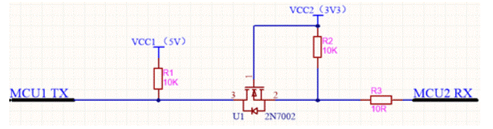 先說一說這個電路的用途:當兩個MCU在不同的工作電壓下工作(如MCU1工作電壓5V;MCU2工作電壓3.3V),那么MCU1與MCU2之間怎樣進行串口通信呢?很明顯是不能將對應的TX、RX引腳直接相連的,否則可能造成較低工作電壓的MCU燒毀!
