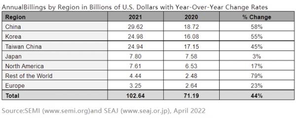 國(guó)際半導(dǎo)體產(chǎn)業(yè)協(xié)會(huì)SEMI發(fā)布《全球半導(dǎo)體設(shè)備市場(chǎng)統(tǒng)計(jì)報(bào)告》(Worldwide Semiconductor Equipment MarketStatistics (WWSEMS) Report)指出,2021年全球半導(dǎo)體制造設(shè)備銷售額激增,相比2020年的712億美元增長(zhǎng)了44%,達(dá)到1026億美元的歷史新高。其中,中國(guó)大陸地區(qū)再度成為全球最大的半導(dǎo)體設(shè)備市場(chǎng)。