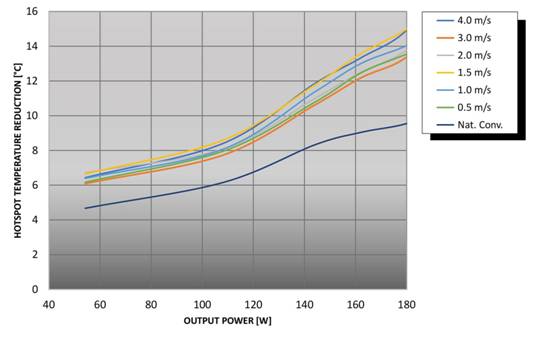 另一個(gè)變數(shù)是 DC/DC 轉(zhuǎn)換器是否安裝了基板。通過(guò)強(qiáng)制風(fēng)冷,一般可選擇使用“開(kāi)放式框架”部件,或配備基板的部件。雖然可能沒(méi)有傳導(dǎo)冷卻,但基板具有散熱作用,并能夠提供一個(gè)平坦的表面來(lái)散熱,因此它的效果是有益于散熱。例如,F(xiàn)lex Power Modules 的數(shù)據(jù)表明,在高負(fù)載和高氣流速度下,安裝基板與未安裝基板相比,PKU4213D 產(chǎn)品熱區(qū)最多可降低 15℃ 左右(圖 3)。