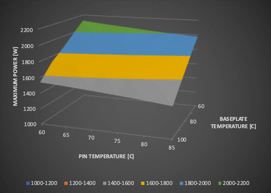 圖 4:DC/DC 模塊的引腳和基板溫度與可用負(fù)載的 3 軸關(guān)系曲線比簡(jiǎn)單的氣流降額數(shù)據(jù)更準(zhǔn)確。(來(lái)源:Flex Power Modules,BMR491部件)