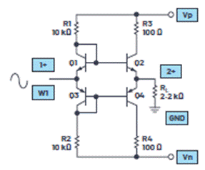 開始之前,請(qǐng)確保關(guān)閉ADALM2000上的電源。電路和實(shí)驗(yàn)室硬件的連接如圖1所示。示波器輸入1應(yīng)連接到Q1和Q2基極的接合處。示波器輸入2應(yīng)連接到Q1和Q2發(fā)射極的接合處。