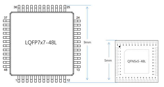 WS49T31xQ系列采用QFN5x5-48L封裝,相對(duì)于傳統(tǒng)LQFP7x7-48L封裝,尺寸縮小近70%。小型化封裝大幅降低了PCB的占用,對(duì)可穿戴或便攜式設(shè)備的ID設(shè)計(jì)十分友好。