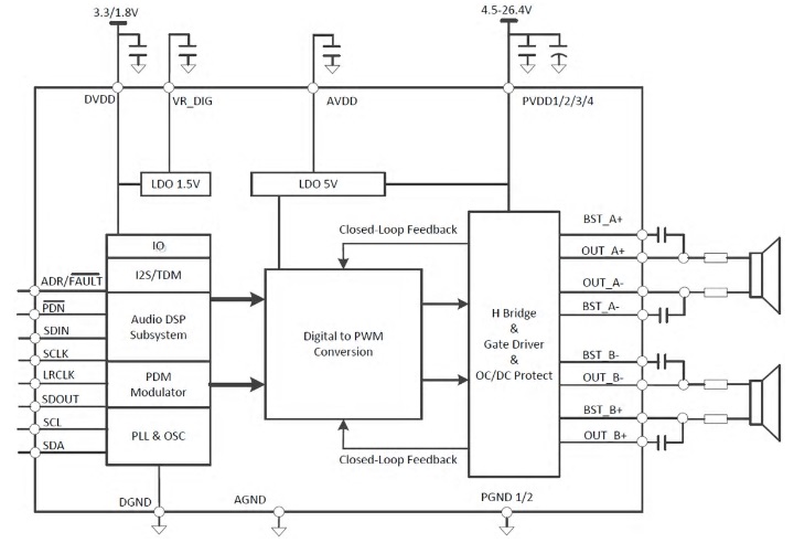 50W立體聲/100W單聲道、數(shù)字輸入音頻功放芯片,內(nèi)置DSP多種音頻處理效果 |