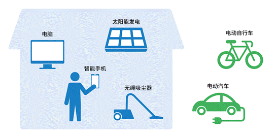 其他還有無繩吸塵器、熨斗等小型家電、電動自行車、電動摩托車等乘騎工具、利用家用太陽能發(fā)電蓄積白天發(fā)的電等用途也都使用鋰離子電池。