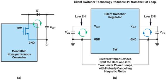(b) Silent Switcher轉(zhuǎn)換器具有兩個(相反)熱回路和全集成開關(guān)。