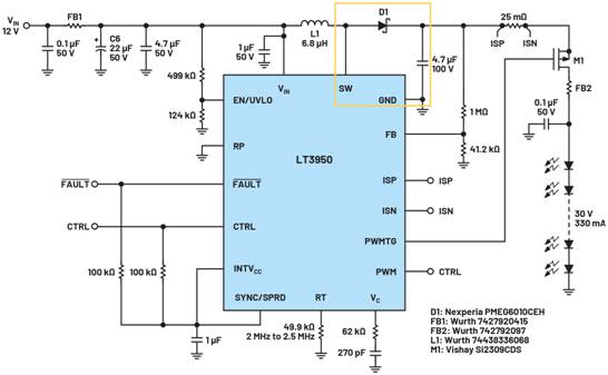 圖3.LT3950 LED驅(qū)動器是一個異步單芯片1.5 A、60 V升壓轉(zhuǎn)換器。